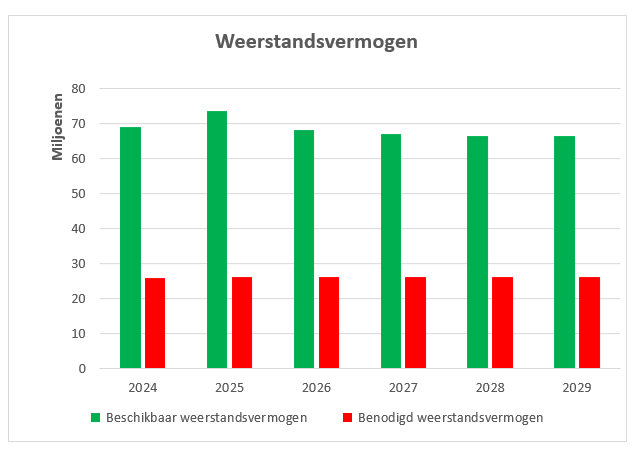 Op basis van de laatste risico-inventarisatie is de benodigde weerstandscapaciteit berekend op € 26,1 miljoen (=benodigd weerstandsvermogen). Op basis van de kaderstelling bestaat het beschikbaar weerstandsvermogen uit de algemene reserve 'sec', onvoorzien incidenteel en de onbenutte belastingcapaciteit. Het beschikbaar weerstandsvermogen is bijna € 68,1 miljoen eind 2026 tot ruim € 66,2 miljoen eind 2029.