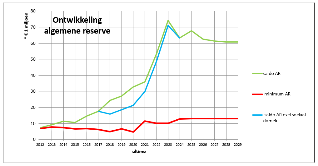 De verwachte stand van de algemene reserve is eind 2029 bijna € 60,8 miljoen. Dit is nog ruimschoots boven het minimale niveau van de algemene reserve van afgerond € 13,1 miljoen (is 50% van het herijkte risicoprofiel; zie de grafiek hieronder).