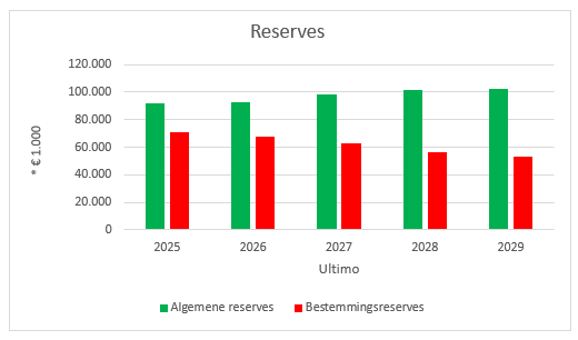 de algemene reserve 'sec' daalt van € 67,9 miljoen eind 2025 naar € 60,8 miljoen eind 2029.