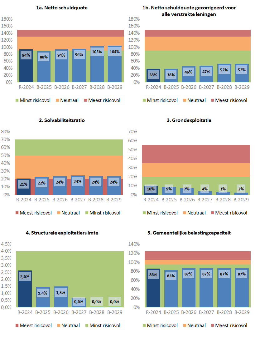 Met dit kengetal wordt de hoogte van de lokale lastendruk vergeleken met het landelijk gemiddelde. Tussen de 95 en 105% wordt als "neutraal" geduid. In 2026 is de ruimte om belastingen te verhogen, als we ons spiegelen aan het Nederlandse gemiddelde, afgerond 87%. Deze waarde valt in de categorie "minst risicovol". We hebben daarmee ten opzichte van het landelijk gemiddelde - los gezien van de politieke wenselijkheid - naar algemene maatstaf ruimte om onze belastingen te verhogen als dit noodzakeliijk zou worden.